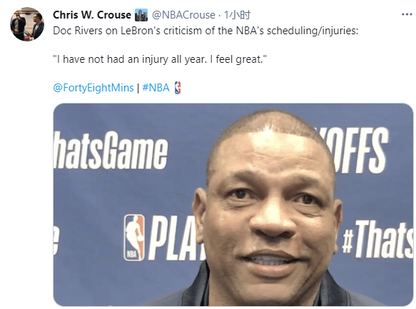 詹姆斯抱怨联盟引热议,费城主教练道格-里弗斯表示:当勒布朗说话的时候,我们都会听的;里弗斯还调侃:我没有受伤,我一整年都没有受伤,我感觉好极了。