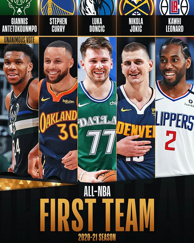 24直播网讯 北京时间6月16日,NBA官方公布了2020-21赛季的最佳阵容名单。在最佳阵容的评选中,字母哥得到100张第一选票,全票入选一阵,算上今年,字母哥已经连续三年同时入选一阵一防; MVP约老师拿了99张第一选票,498分名列第二,库里则是496分位居第三。