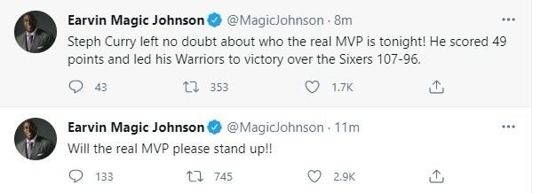 至今为止库里已经有连续11场比赛都拿到了超过30分的分数,这让他成功在赛季末段超车比尔成为了常规赛得分王,而且如果库里按照这个状态一直打完四月份,那么库里将有很大机会成为本赛季的得分王。不得不说库里最近的状态真的是太可怕了,就连历史第一控卫魔术师约翰逊都被库里的表现给震撼了,一向见惯大场面的魔术师忍不住连续发推盛赞库里,他说请真正的MVP起立,而库里就是今晚真正的MVP!