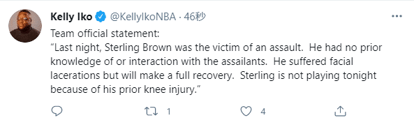 休斯敦火箭官宣,发表声明:球队后卫斯特林-布朗在昨晚的一次袭击事件中受伤,他事先对袭击者一无所知,也没有与之发生接触;斯特林-布朗的面部被划伤,将会完全康复,他今天缺席比赛是因为之前的膝伤,而不是脸伤。