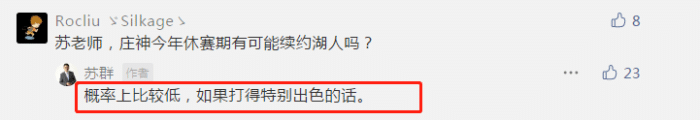 也有网友发出疑问,“苏老师,庄神如果今夏留在湖人,能得到什么样的合同呢”。而苏群老师的回应很直接,“我觉得不能满足他的胃口,毕竟他在二十七八,当打之年”。