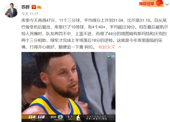 苏群也为库里鸣不平“自从尾巴骨受伤后复出,库里打了10场球,有4个40+,平均超过39分。但在最后被凯尔特人死缠时,队友两罚不中、上篮不进,而得了44分的塔图姆有斯玛特和沃克的两个三分相助,绿军才完成上半场落后16分的逆转。这就是今年库里面临的环境,打得开心就好,顺便追一下雷-阿伦。”