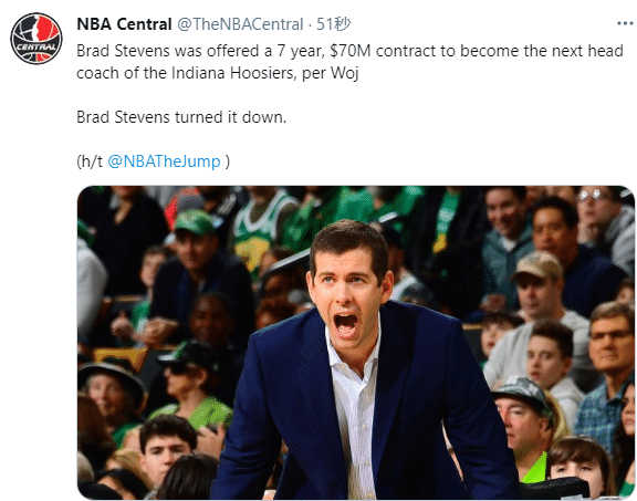 24直播网讯北京时间4月18日,据ESPN名记沃纳罗斯基报道,凯尔特人主帅布拉德-史蒂文斯拒绝了一份来自印第安纳大学7年7000万美元的主教练合同;少帅拒绝7年7000万美元大合同,年薪高达千万美元,目前史蒂文斯年薪不详,去年他和球队达成提前续约合同。