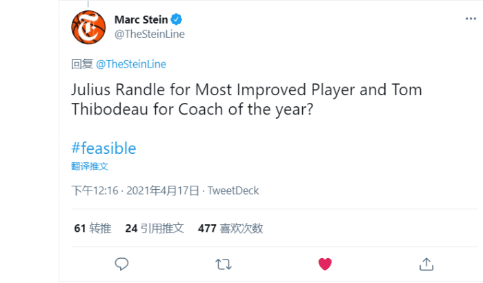名记发推表示:兰德尔和锡伯杜应该分别当选年度进步最快球员和最佳教练?