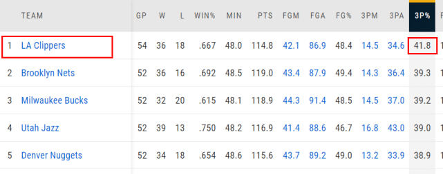24直播网讯北京时间4月10日,快船主场126-109击败火箭。本场比赛,快船三分球37投19中,再次展露了外线的实力。赛季至今,快船的三分命中率达到41.8%,排名联盟第1,而且是唯一一支三分命中率超过四成的球队。