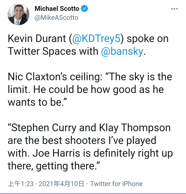 24直播网讯北京时间4月10日,篮网球星凯文-杜兰特在社媒上称赞自己的两位队友:乔-哈里斯和尼古拉斯-克拉克斯顿。篮网之所以如此强大,不仅仅在于他们拥有超级球星,还在于他们的角色球员同样表现出色。