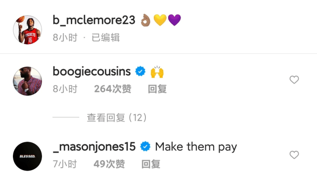 24直播网讯 北京时间4月7日,湖人官方宣布签下新援本-麦克勒莫。随后,麦克勒莫更新个人社媒,晒出了自己身穿湖人球衣的照片,并配上了紫金爱心的表情。值得一提的是,麦克勒莫发出这张照片后不久,浓眉、考辛斯等人都为他点赞。曾和麦克勒莫在火箭共事过的队友梅森-琼斯在评论区里写道:“让他们付出代价。”