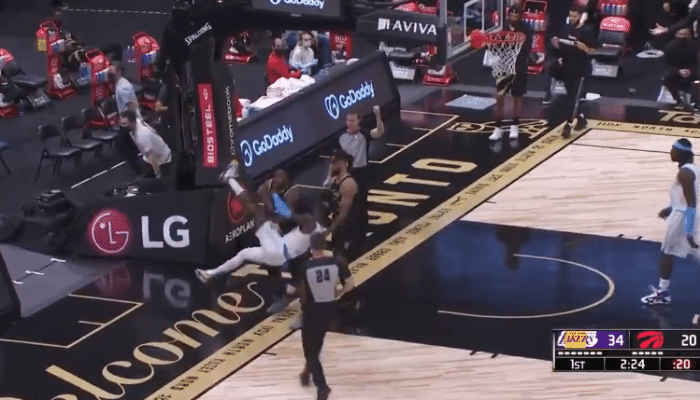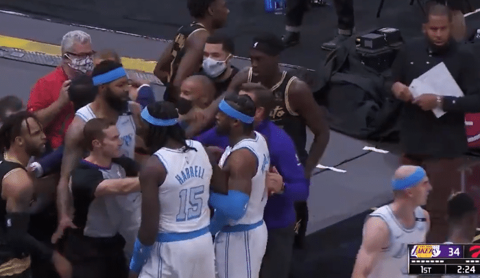 24直播网讯今天NBA常规赛湖人客场挑战猛龙,这场比赛期间双方爆发冲突,时间是在首节还剩2分24秒的时候,阿奴诺比上篮的时候被施罗德犯规,随后他直接抱摔施罗德,从而引发了双方的冲突,哈雷尔、特伦特等人纷纷上前,其中哈雷尔为队友出头,情绪很大。之后裁判看了现场的回放,给出的判罚结果是抱摔施罗德的阿奴诺比和给队友出头的哈雷尔技术犯规被驱逐,施罗德被吹投篮犯规。