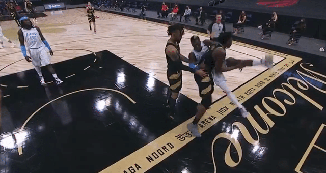比赛开场仅仅2分多钟,猛龙队的阿奴比上篮时被施罗德犯规拦下,看到阿米奴有失去重心的迹象,施罗德抱住了阿米奴避免其受伤,可就是这个动作激怒了阿米奴,阿米奴认为施罗德的动作是故意伤害自己。