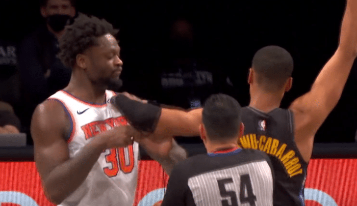 当时的卡巴罗为了防止兰德尔在低位要球,故意加强身体对抗采取半绕前的方式,兰德尔努力摆脱,两人在力量对抗时卡巴罗有些不满,被推了一把后兰德尔怒目圆睁口中念念有词,阿德站在两人中间充当和事老!赛后的兰德尔被问到这件事时,他丝毫不留情面“我不确定,我不确定他有什么毛病……就像我说的,在我打球时,我担心的不是他这样的球员,我要面对的是篮网其他球星”