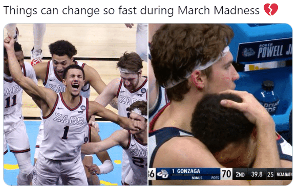 冈萨加大学陷入困境之时,状元大热门萨格斯连续命中两记三分带队继续反扑,虽然落后很多,萨格斯依旧拼命追分,助攻队友命中三分,然后抢断造犯规拿到两罚一掷,可场上发生意外事件,冈萨加首发阿亚伊受伤倒地,根本不用用力,被搀扶下场。