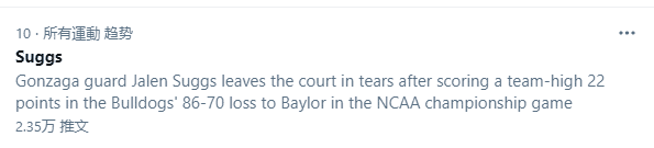 上一场比赛,萨格斯投进超远压哨三分带队杀进决赛,当时他跳上桌子疯狂庆祝,可如今萨格斯哭成泪人,这是他的大学生涯最后一个赛季,预计将会参加NBA选秀;状元大热哭泣的画面瞬间冲上推特热搜引热议,真是太遗憾了。