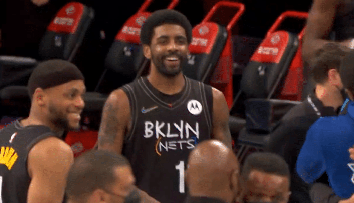 赢球后欧文心情大悦,第一时间双手握拳庆祝,和队友拥抱庆祝胜利,满脸笑容十分开心;值得一提的是尼克斯球星兰德尔扭头看了一眼篮网众将庆祝,然后直接走回更衣室。