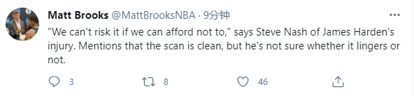 赛后篮网主帅纳什回应哈登伤情,表示:如果我们承担不起,我们就不能冒险;哈登的检查结果显示无碍,但不清楚他何时能够复出。