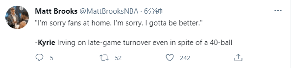 为何欧文道歉?原因是关键时刻他失误了,终场前37秒,欧文传球太大,卡巴罗没有接住,欧文把球传出界,随后伯克斯投进追平三分,当时欧文十分懊恼,这一次失误险些葬送胜局,所幸最终篮网笑到最后,欧文轰下40分7篮板带队赢球,惊险拿下胜利。