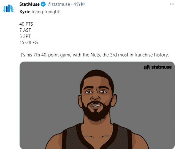 篮网赢球的同时,欧文创纪录,篮网生涯第七次单场40+到手,成为篮网队史第三人,排在欧文前面的是约翰-威廉森(8次)和文斯-卡特(17次)。