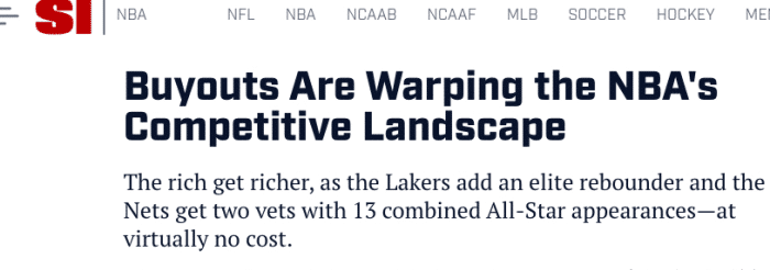 事实上,从表面上看是湖人篮网招募得到的强援,但据《体育画报》记者Howard Beck报道,一名小市场球队的总经理向他透露,很多中小市场球队都受到了来自球员经纪人的威胁,也就是说,包括骑士活塞等球队都是感受到了来自球员的压力导致被迫买断,促使湖人篮网抢人成功的!