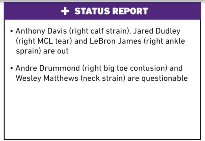 快船将在明天凌晨3点30分对阵湖人,洛杉矶同城德比又来了,可湖人伤病满营,詹姆斯(脚踝扭伤)和浓眉(右小腿拉伤)全都因伤缺阵;庄神(脚趾挫伤)和马修斯(脖子扭伤)被列为可能出战,庄神首秀弄伤脚趾,脚指甲脱落,马修斯上一场撞伤脖子,导致伤势加重。