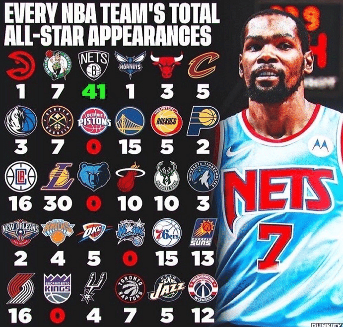 24直播网讯近日外媒统计NBA现役各队球员入选全明星次数总和,在这份统计图中可以看出,篮网以41次傲视群雄,他们队内有6人入选过全明星,其中杜兰特最多11次,赛季中期加盟的哈登是9次,欧文和阿尔德里奇都是7次,格里芬6次,小乔丹也有一次入选全明星的经历。在联盟中,篮网也是队内球员入选全明星次数唯一一支超过40次的球队。