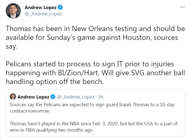 鹈鹕为什么会突然决定签约小托马斯?跟队记者Andrew Lopez曝光了原因。鹈鹕在英格拉姆、锡安和哈特出现伤病前,就开启了签约小托马斯的计划。他们的目的是为大范甘迪提供替补席上的又一个持球选择。Lopez表示,小托马斯已经抵达新奥尔良接受检测,预计可以出战当地时间周日对火箭的比赛。
