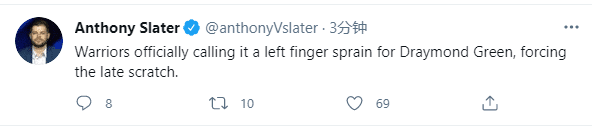 24直播网4月3日讯 库里因尾椎骨酸痛缺席勇士和猛龙的比赛,当家星球伤停还有还坏消息,据勇士跟队记者Anthony Slater报道,勇士官方宣布追梦格林因左手手指扭伤缺席比赛,因伤临时退赛,勇士又遭重创,伤病不断太倒霉了。