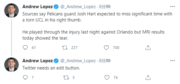 24直播网4月3日讯 鹈鹕遭遇伤病大麻烦,锡安、英格拉姆、鲍尔都在伤病名单上,哈特则是重大伤病,据鹈鹕记者AndrewLopez报道,鹈鹕后卫约什-哈特因遭遇右手拇指副韧带撕裂,预计将长期缺阵,很可能常规赛提前报销。