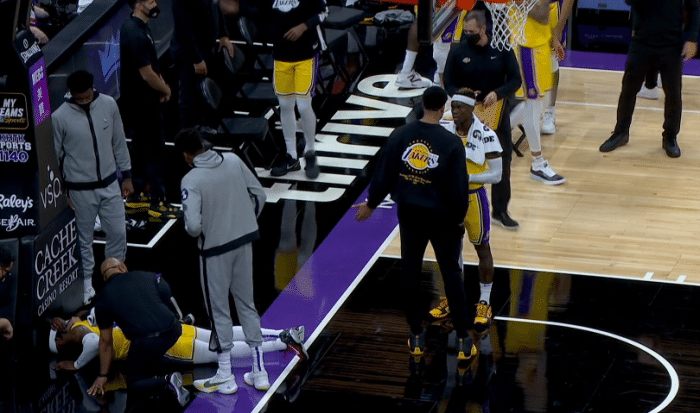 第一节快结束时,马修斯持球突破杀到禁区,上篮时身体失去平衡,直接摔出底线,倒地时,马修斯的脖子撞到篮球架,随后马修斯倒地不起,一直捂着受伤的脖子,湖人队医赶紧冲过来;当时浓眉等人站在附近,浓眉还和施罗德沟通了一下。