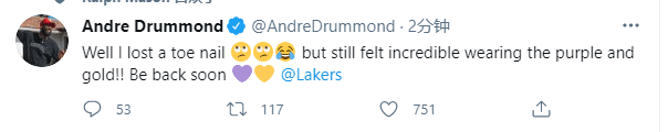 24直播网讯 湖人新援庄神首秀仅打14分钟便受伤离场,湖人记者报道庄神最多伤停1-2场;对于自己的伤情,庄神本人更新社媒媒体,发推写道:好吧,虽然我失去了一个脚指甲(3个哭泣表情),但我依旧对穿着紫金战袍感到不可思议,我很快就会重返赛场。