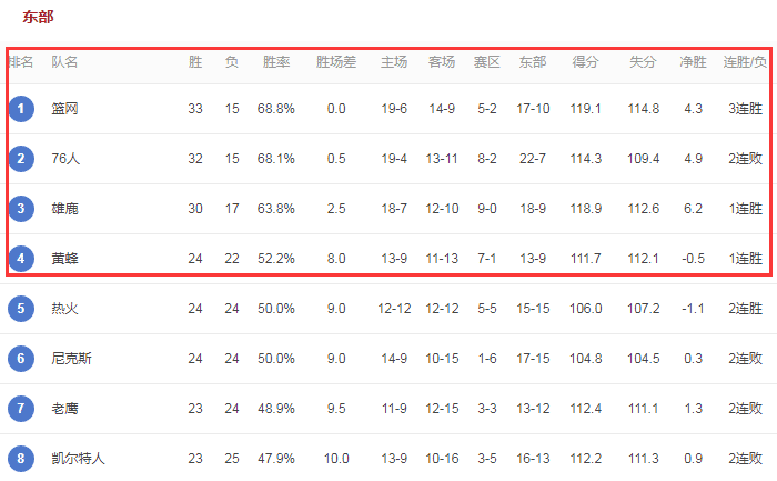 33胜15负,胜率68.8%,在拿下3连胜的同时,篮网坐在了东部第一的位置上,但76人雄鹿同时是胜率超过60%的球队,所以篮网3连胜+东部第一的表现,不是十拿九稳的东部老大,而且篮网也面临一个较大弊端,那就是队内巨星的健康问题。