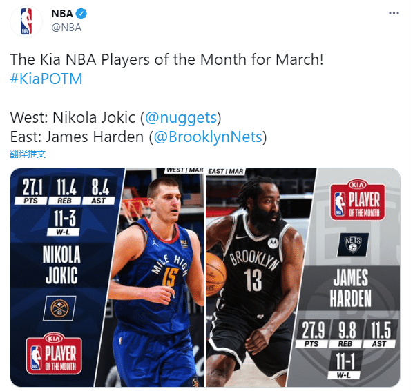 24直播网讯 NBA官方正式公布三月月最佳球员,西部约基奇和东部哈登荣誉当选,哈登连续两个月当选东部最佳创纪录;三月月最佳新秀也出炉。