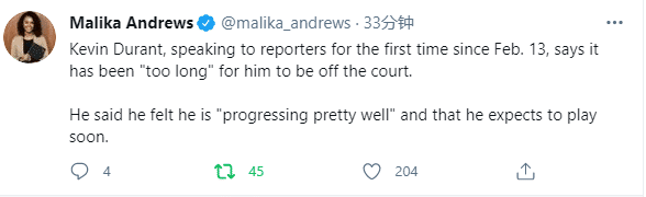 究竟杜兰特的腿筋伤势有多严重?杜兰特表示他本以为腿筋是一级拉伤,结果检查结果显示,情况要比一级拉伤更严重;目前杜兰特伤势已经接近100%痊愈,此前名记shams透露杜兰特已经无限接近复出,预计将在下周重返赛场,杜兰特也希望能够尽快归队。