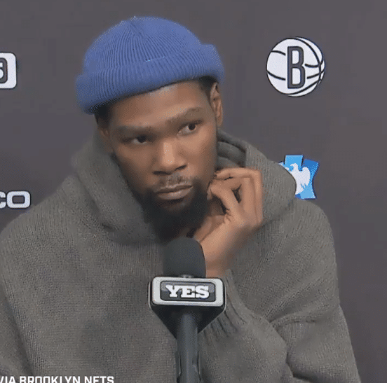 32岁杜兰特身穿针织连帽外套出镜,戴着一顶抢镜的蓝色针织帽。