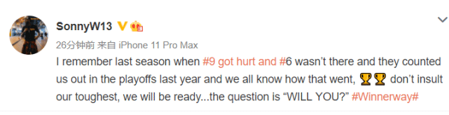 24直播网讯北京时间4月1日,广东外援威姆斯在个人社交媒体更新动态,动情地写道:我记得上赛季,当9号易建联受伤、6号马尚·布鲁克斯不在的情况下,他们都认为我们在季后赛没戏了。但只有我们自己知道,我们是如何走到最后的。不要低估我们夺冠的坚强意志,我们会准备好的,问题只在于“你想不想去做到”!