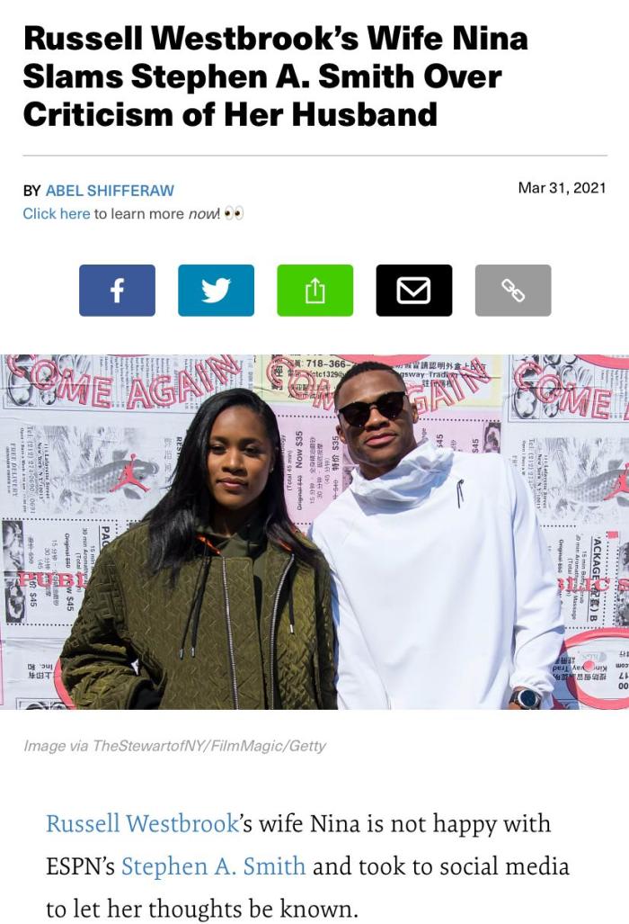 事实上史密斯曾经不止一次在公开节目中批评威少,史密斯似乎一直都看不起威少的战绩,他觉得就算威少拿到再多的三双也无法证明他有很强的实力。而且史密斯还曾经多次给威少提出建议,他认为威少早就应该加强自己的投射,不然的话依靠他现在的打法很快就会下滑。当大家以为脾气暴躁的威少将会和史密斯展开骂战的时候,没想到的是威少的妻子居然站出来回应了史密斯,上演了力挺丈夫的好戏。
