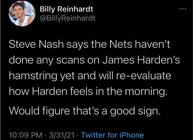 赛后接受采访,篮网主帅纳什被问及到了哈登的伤病,官方的解释是右腿筋紧张,纳什称:“这是球队在看了哈登的腿筋伤势之后做出的决定,我们只是觉得不值得冒这个险让他继续留在场上。球队将持续关注哈登伤势,根据明早哈登感觉来决定是否出战明天对阵夏洛特的背靠背比赛。我们对他的伤势感到乐观,他不会长期缺席比赛。”