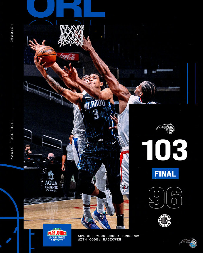 24直播网讯:北京时间3月31日,2020-21赛季NBA常规赛继续进行,洛杉矶快船坐镇主场迎战奥兰多魔术。全场打完,快船96-103爆冷不敌魔术,6连胜宣告终结。