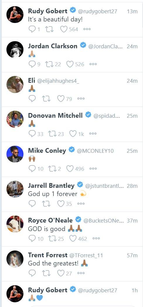 爵士全队逃过一劫,安全降落之后,爵士众将发推报平安;米切尔等人在社交媒体上发布祈祷的表情,戈贝尔则是发推:这是一个美好的日子;爵士队正在盐湖城等到一架新飞机,然后飞往孟菲斯,将在明天上午8点对阵灰熊。