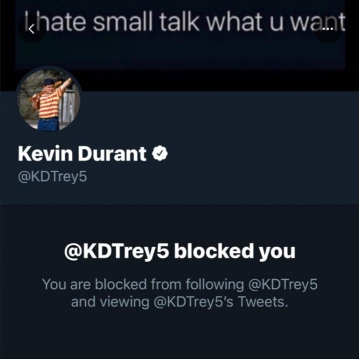 一位网友发推写道:“@杜兰特,不要在网上回复那些负能量的帖子了,能不能给你真正的球迷送上几双球鞋和一件签名球衣?另外,篮网总冠军。”然后这位网友就直接被拉黑了,不仅如此杜兰特还发了一段暴躁老哥怼人的视频回应他。