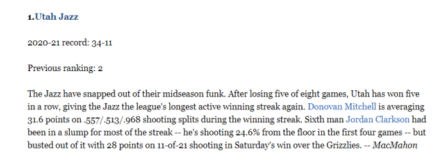爵士已经摆脱赛季中期的低迷,重回实力榜的首位,他们取得了5连胜。米切尔在这波连胜中状态极佳,场均31.6分,投篮命中率55.7%,三分命中率51.3%,罚球命中率96.8%。第六人克拉克森在这波连胜的前4场很低迷,投篮命中率只有24.6%,但他在击败灰熊的比赛中迎来爆发,一人轰下28分,投篮21中11。