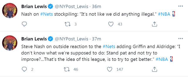 纳什回应道:“我不知道我们该怎么做:保持不变,不尝试去提升自己吗?这就是联盟的理念,尝试变得更强。我们只是希望找到球队需要的所有拼图。”纳什还表示:“我们又没做什么违法的事情。”