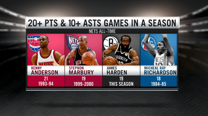 随着本场送出12次助攻,哈登生涯常规赛助攻数达到5702次,超越拉里-伯德(5695次)和韦德(5701次)升到历史助攻榜第42位,连超凯尔特人名宿和热火名宿;哈登上半场送出8次助攻,超越伯德,下半场又轻松送出4次助攻,从而超越两大名宿破纪录。