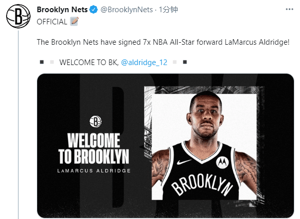 篮网官方晒出阿德身穿篮网球衣的照片,发推写道:篮网已经签下7届全明星前锋阿尔德里奇,欢迎阿德来到布鲁克林!