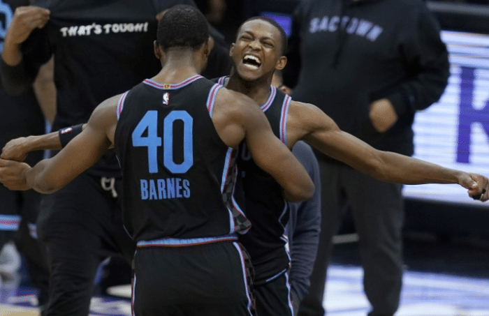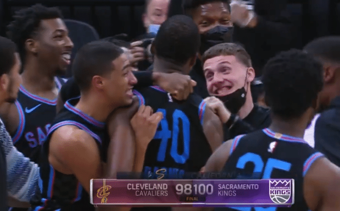 24直播网讯北京时间3月28日,NBA赛场诞生了一场极为神奇的比赛。在国王和骑士的对决中,双方在最后时刻紧咬比分,结果出现了准绝杀,反绝杀,再到压哨绝杀的神剧情!巴恩斯在最后1.6秒接到后场的长传,转身命中三分球,复制了当年詹姆斯的绝杀时刻!而国王全队获胜后也疯狂涌向巴恩斯庆祝,骑士球员则一脸蒙圈,不敢相信发生的一切。