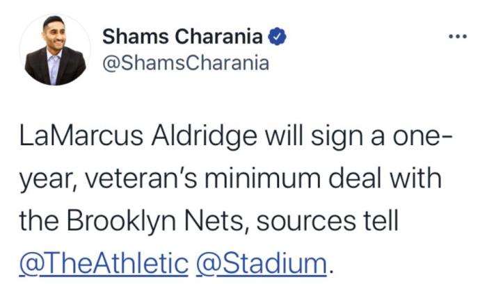 24直播网讯北京时间3月28日,据NBA名记Shams报道,阿尔德里奇将与篮网队签下一份一年的老将底薪合同。此前阿德已经正式和马刺达成了买断协议,从买断时间开始算起,48小时之后阿德将正式度过澄清期,届时阿德可以与任意球队签约。阿德签约篮网也宣告湖人正式出局,接下来他们恐怕要将重心放在招募德拉蒙德的身上了。