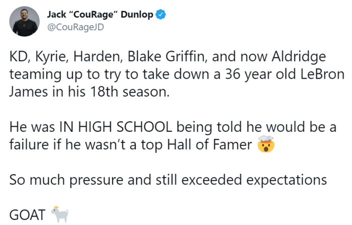 “杜兰特、欧文、哈登、格里芬,现在又是阿尔德里奇,全部联手想要去击败生涯第18个赛季已经36岁的詹姆斯!在高中的时候,詹姆斯就被告知如果他未来不是一名顶级的名人堂,那就是失败!如此巨大的压力,勒布朗仍然超出了人们的预期!GOAT历史最佳!”