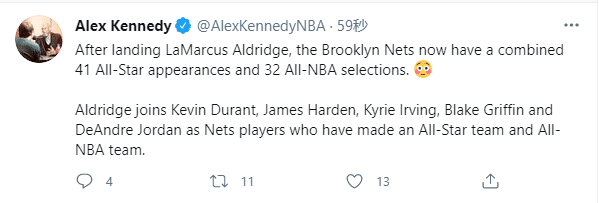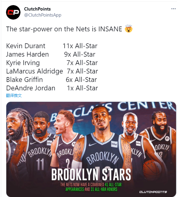 引援阿德之后,篮网阵容变得更加豪华——全队已经有6名全明星球员,总共41次入选全明星以及32次入选最佳阵容,在全明星入选次数方面,杜兰特11次、哈登9次、欧文和阿德都是7次、格里芬6次和小乔丹1次;美媒发推写道:篮网全明星阵容太疯狂了。