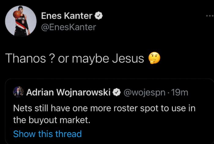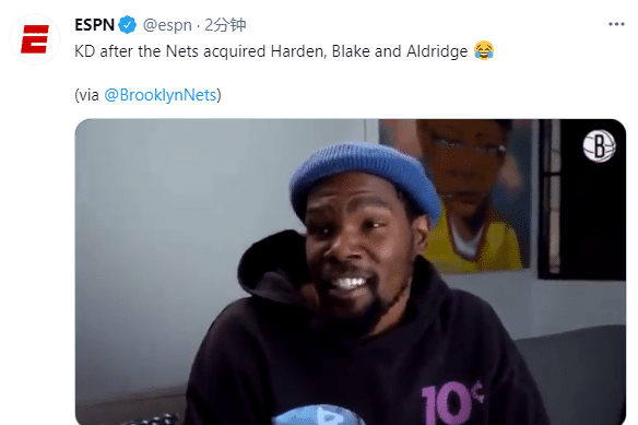 美媒ESPN第一时间发推调侃杜兰特,篮网引援哈登、格里芬和阿德之后,杜兰特的反应——满脸笑容;恐怕此时杜兰特正在家偷笑呢;小托马斯发推写道:篮网现在就想赢得总冠军;开拓者球员坎特直言:灭霸?或者可能是耶稣。