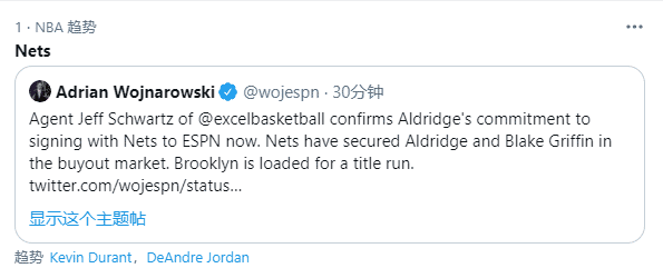 阿德将会在篮网中锋位置上获得大量的上场时间,此前篮网仅花120万美元便成功引援格里芬,现在又用老将底薪引援阿德,篮网疯狂操作打造一支超级豪华的冲冠阵容;篮网签约阿德瞬间冲上推特热搜榜榜单,引发巨大的热议。
