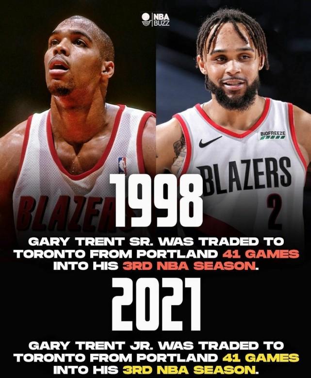 1998年,加里-特伦特(小特伦特的父亲)被开拓者交易到猛龙,那是他进入NBA的第三个赛季,那个赛季他打了41场比赛。巧合的是23年后,他的儿子也被开拓者交易到猛龙,同样是进入NBA的第三个赛季,同样在这个赛季打了41场比赛。