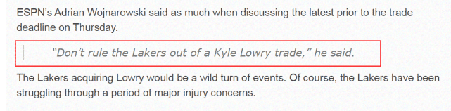 湖人要想得到洛瑞,只能通过交易的方式,跟队记者哈里森-费根表示他很难想象湖人要送出哪些筹码,才能配平薪金得到洛瑞。毕竟洛瑞的年薪高达3000万美元。赛季至今,洛瑞场均17.6分5.6篮板7.4助攻1.1抢断。